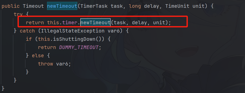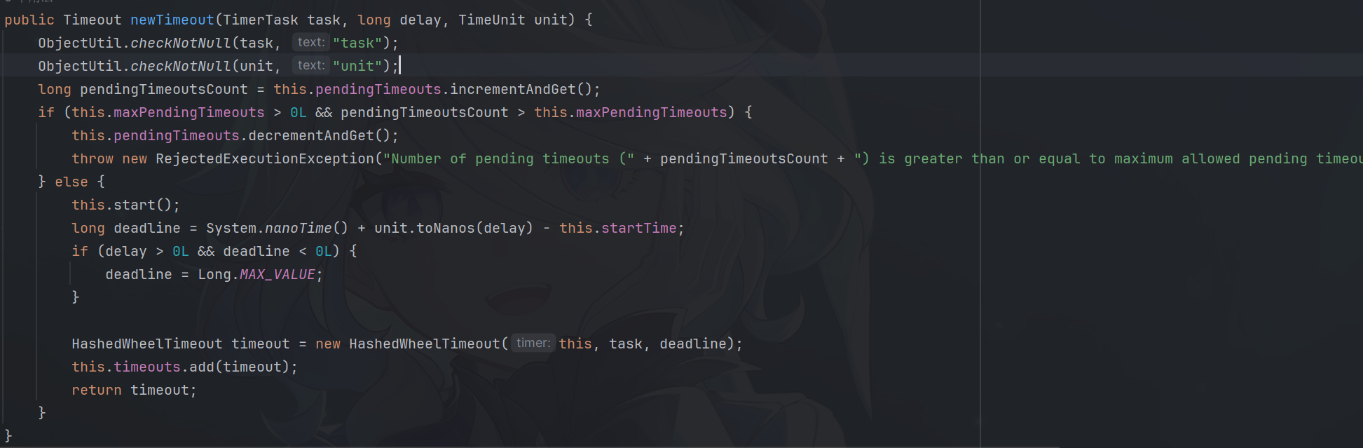 return 一个Timeout(表示你刚刚注册的这个定时任务,你可以通过这个timeout来查看任务状态等等)
