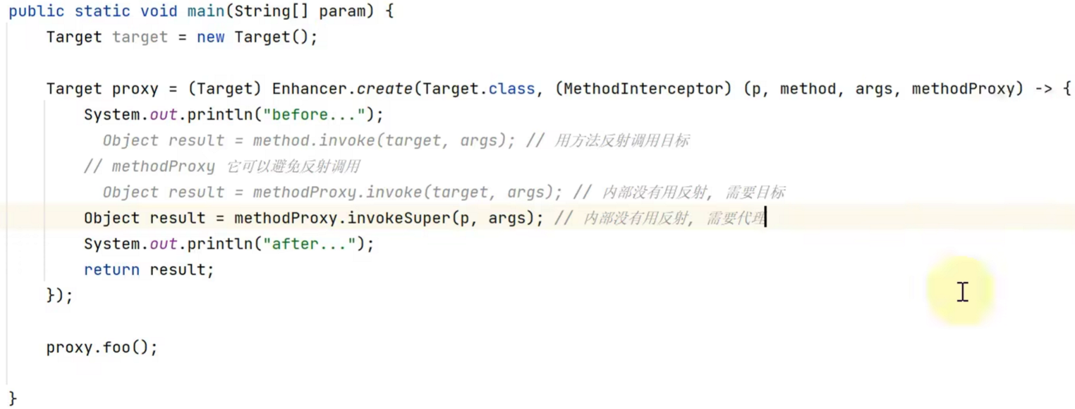 cglib代理不是jdk自带的代理,需要导外部依赖,其底层是让代理类继承目标类,通过Enhancer.create获取代理对象