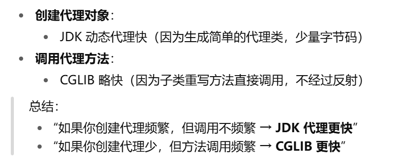 在 JDK1.6、JDK1.7、JDK1.8 逐步对 JDK 动态代理优化之后,在调用次数较少的情况下,JDK 代理效率高于 CGLib 代理效率,只有当进行大量调用的时候,JDK1.6 和 JDK1.7 比 CGLib 代理效率低一点,但是到 JDK1.8 的时候,JDK 代理效率高于 CGLib 代理。所以如果有接口使用 JDK 动态代理,如果没有接口使用 CGLIB 代理。