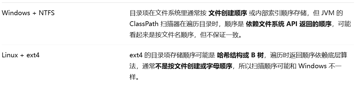 - 不同 JDK、不同文件系统,class 扫描顺序也可能不同。