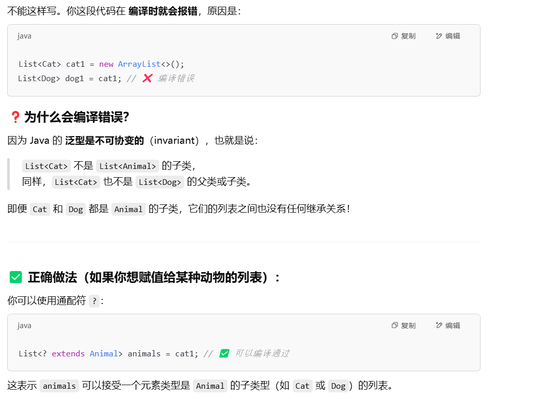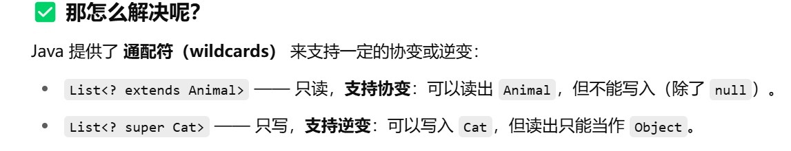 泛型 发表于 2025-04-27 更新于 2025-05-05 分类于 JavaSE 阅读次数: 什么是泛型1.5的时候,出的一种新特性,允许在定义 类、接口或方法 时指定一个“类型参数”,这个参数在使用时再确 定为实际的类型 ** ** 好处就是 编译时就进行类型检查,避免之前运行时Object类型转换错误带来的异常问题 泛型擦除在底层会把泛型擦成 Object 泛型的不可协变性 如何解决泛型的不可协变性