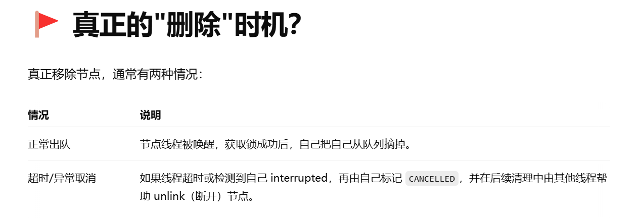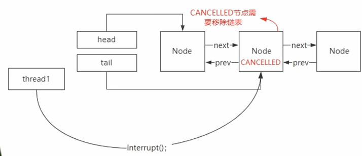 Lock接口里有个lockInterrupt方法,该方法就是说允许加入到阻塞队列里的线程节点被外部所中断。当阻塞队列里的线程被中断后,当线程节点并不会被立马删除,而是会被标记为cancelled状态,然后从尾节点找到离cancelled节点最近的正常节点进行唤醒。同样如果没有前置节点的话,得一个个往下遍历,查询性能很低
