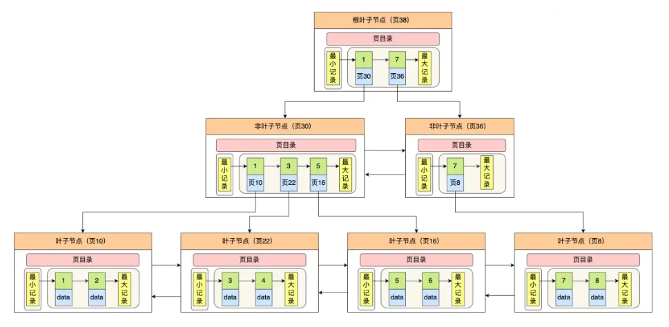 索引页的行记录是指针,指向一个页,索引页的索引键值就是指向的页的最小索引键值