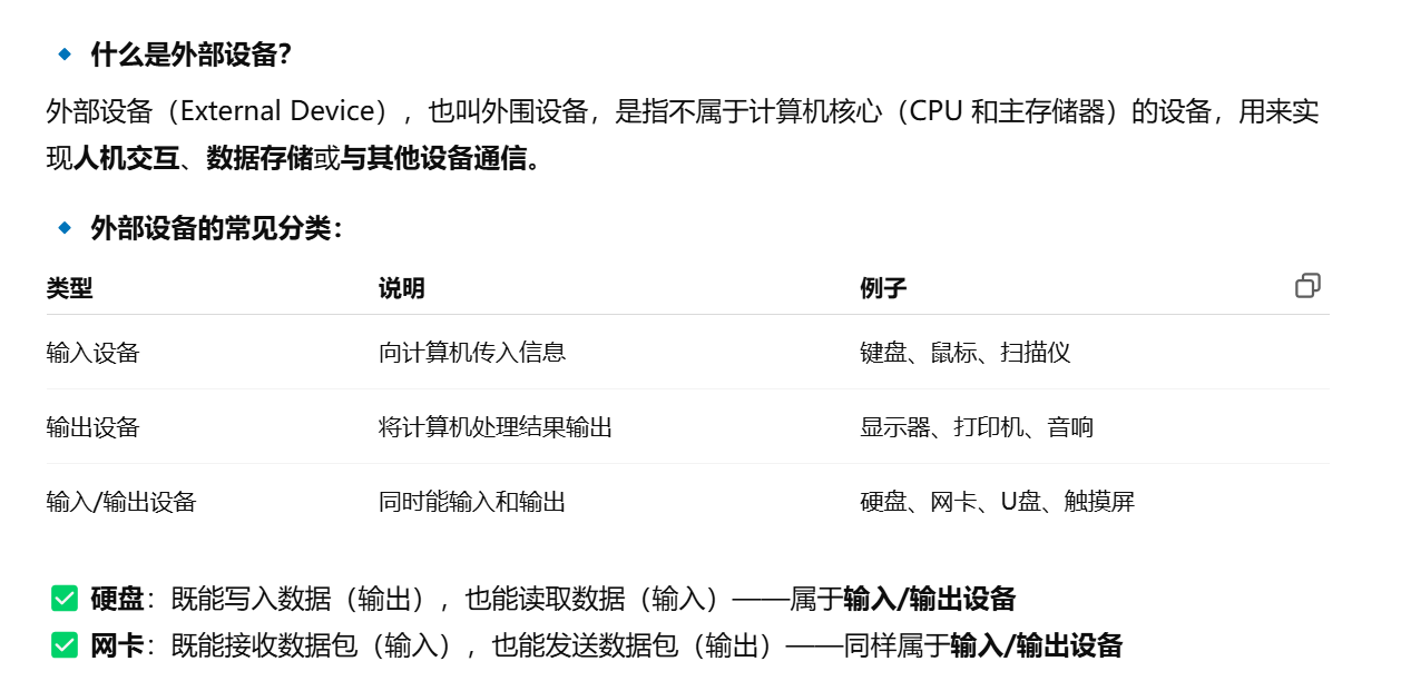 如输入设备(键盘),输出设备(显示屏)就是外部设备,网卡和硬盘也是外部设备