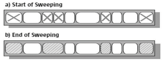 由于采用标记清除算法,所以会不可避免地出现内存碎片的问题。且在给新数据分配内存时,也无法采用指针碰撞,只能维护一个空闲的内存地址列表