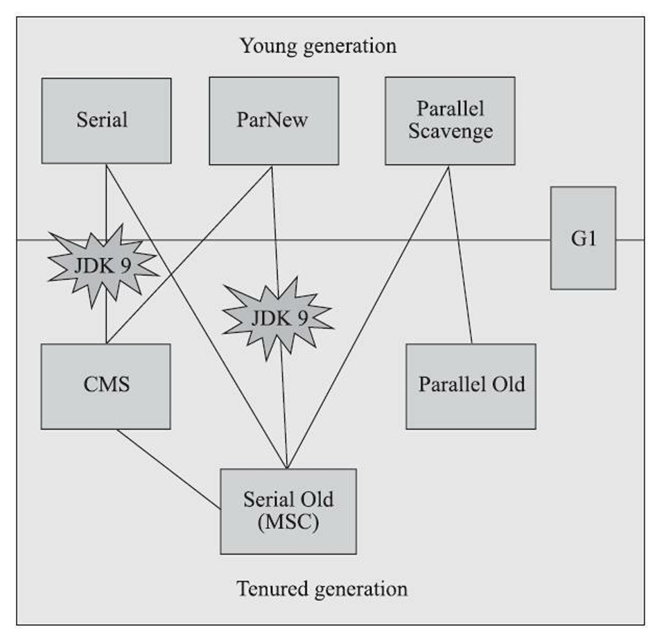 如果两个收集器之间存在连线,就说明它们可以搭配使用,图中收集器所处的区域,则表示它是属于新生代收集器抑或是老年代收集器