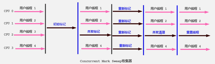 整个垃圾回收过程分为四个阶段:初始标记,并发标记,重新标记,并发清除