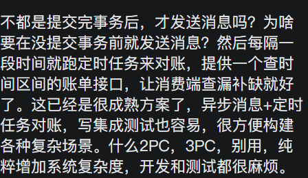为什么禁止事务嵌套消息 发表于 2025-05-25 分类于 场景题 阅读次数: 就是禁止 事务里禁止进行远程调用这种行为 用户下单后会给其补发积分,补发积分是订单模块通过发消息实现的 这里会有个问题,就是权益模块在反查订单时,如果给权益发消息发积分是异步调用就可能会权益系统出现订 单查不到的问题,因为事务的隔离级别的问题(事务没提交,不是同一事务下,是无法查到没提交的事务的) 如果是同步调用的问题,就必查不到的 要怎么解决呢?rpc调用这种事情是不能放在事务内的