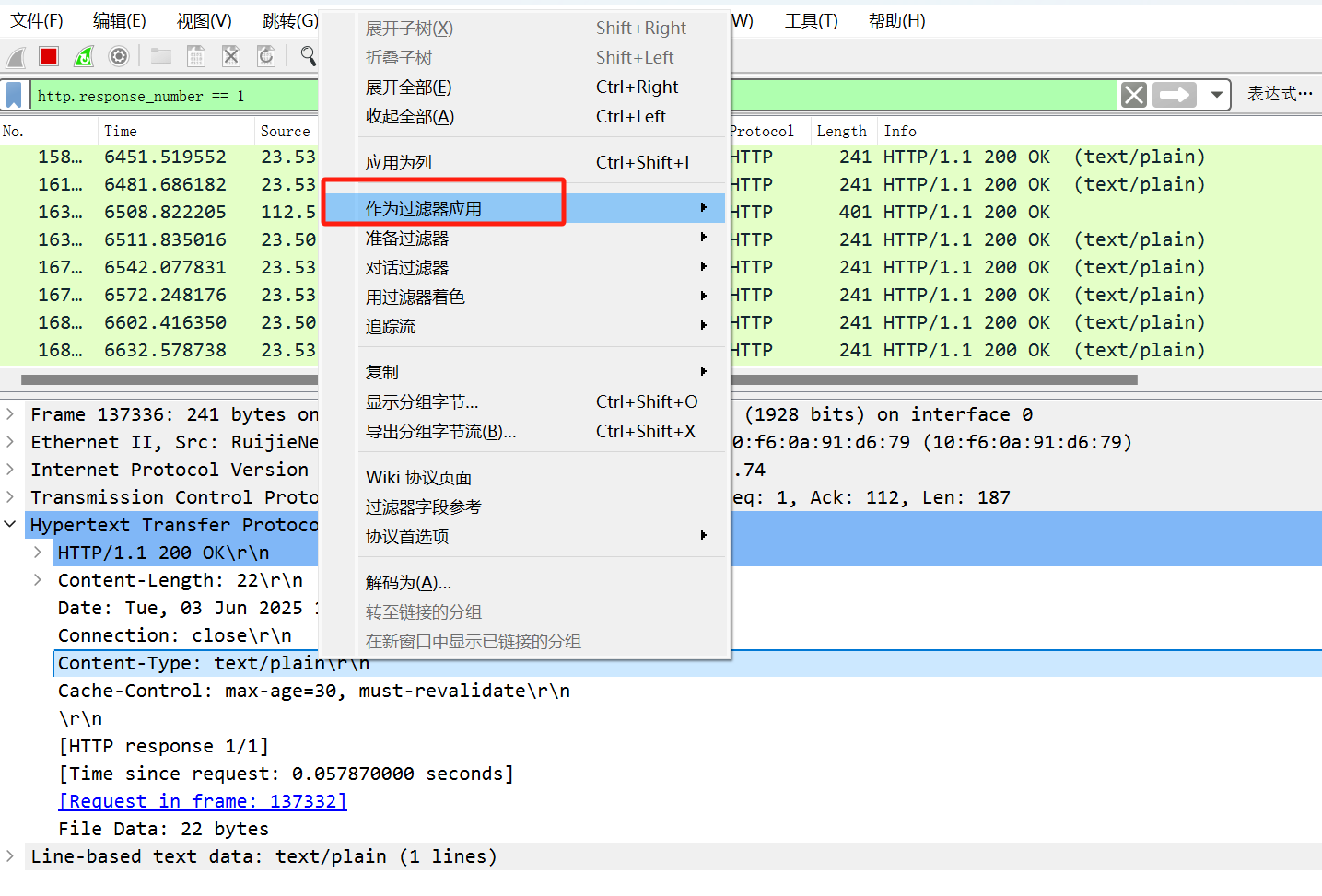 wireshake使用 发表于 2025-06-03 分类于 计网 阅读次数: 基本使用【网络顶级掠食者 Wireshark抓包从入门到实战】https://www.bilibili.com/video/BV12X6gYUEqA?vd_source=cae07b1dce3e6abe67fcf72c43031ede 过滤器: 显示器和捕获过滤器,用来筛选我们想要的信息 显示过滤器,哪里想捕获点哪里 捕获过滤器,数据量大的情况下性能更好 实战wiresake分析TCP三次握手