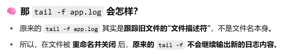 1.使用 tail -F app.log 会检测到文件被替换(即使 inode 改变)并自动重新打开新的 app.log