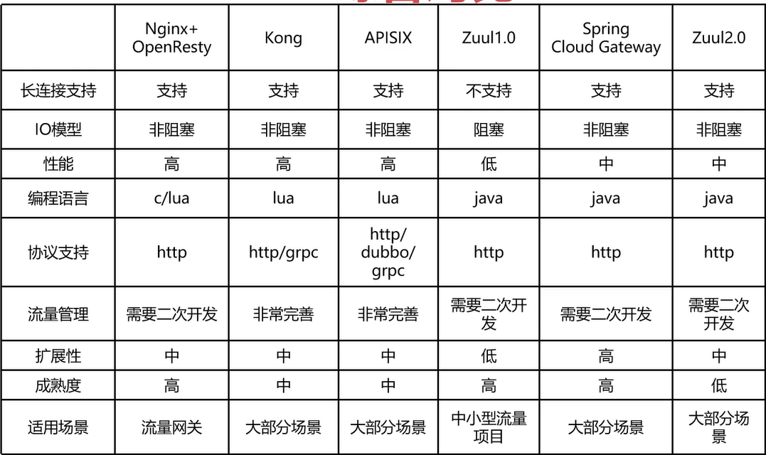 市面上常见网关 发表于 2025-07-12 分类于 项目 , 自研网关 阅读次数: 网关大体分为两种:流量和业务网关 SpringCloud Gateway:依赖Spring生态、启动时间较长 Zuul:早期版本是同步阻塞的,而新版本代码复杂,学习成本高,且停止维护了 Nginx:更适合静态资源的请求,比如html、css、图片、音频、视频等