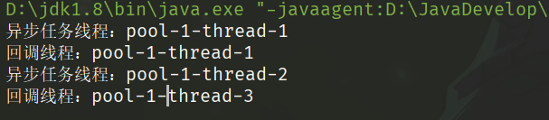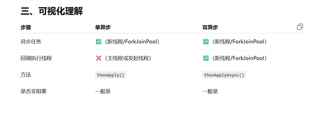//单异步 CompletableFuture<Integer> future3 = CompletableFuture.supplyAsync(() -> { System.out.println("异步任务线程:" + Thread.currentThread().getName()); return 10; }).thenApply(result -> { System.out.println("回调线程:" + Thread.currentThread().getName()); // 可能是主线程 return result * 2; }); //双异步 CompletableFuture<Integer> future4 = CompletableFuture.supplyAsync(() -> { System.out.println("异步任务线程:" + Thread.currentThread().getName()); return 10; }).thenApplyAsync(result -> { System.out.println("回调线程:" + Thread.currentThread().getName()); // 一定是异步线程 return result * 2; });