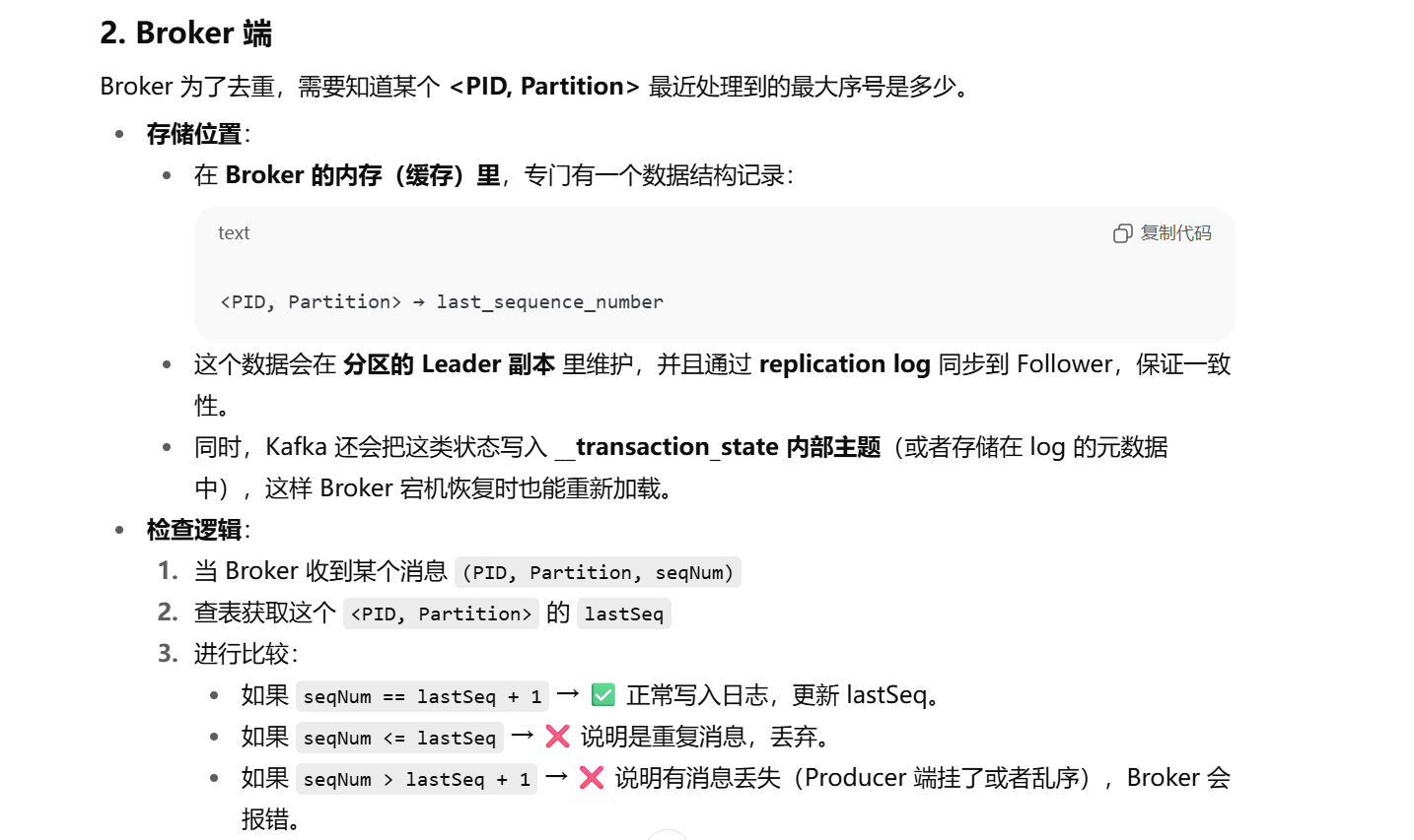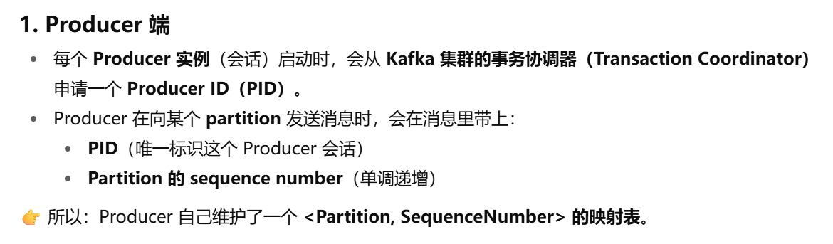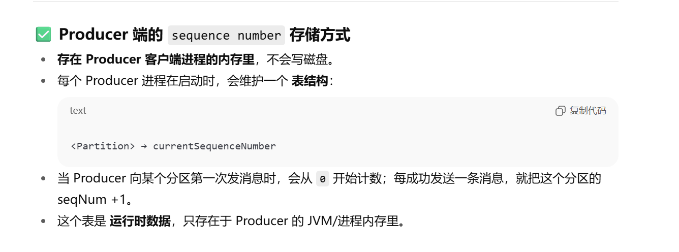 producer会在内存维护一个seqNum,broker端会针对一个producor维护一个 lastSeq