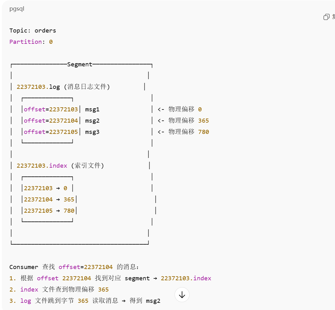 log里面存的是消息,而index里存的是offset和其对应的 物理偏移