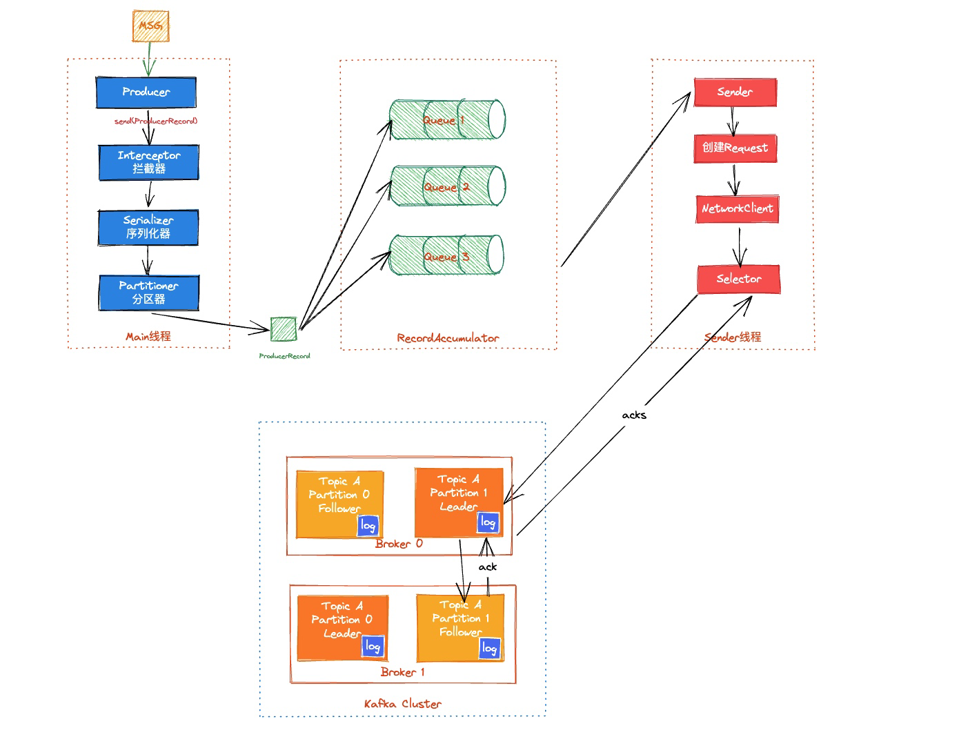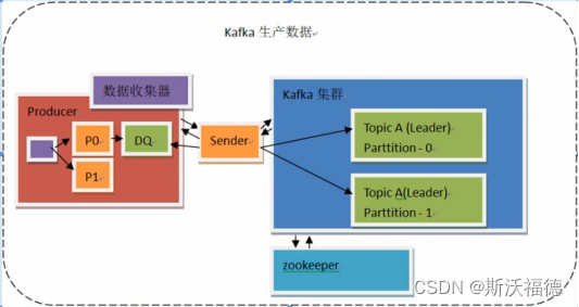 1. producer需要找到集群,并把那个数据放到某个分区中。而这个leader端口号和分区存在zk中,集群和zk一直处于连接状态,partition的leader端口号回由集群去拿出,然后producer会向集群拿到topic对应的partition以及partition的leader信息