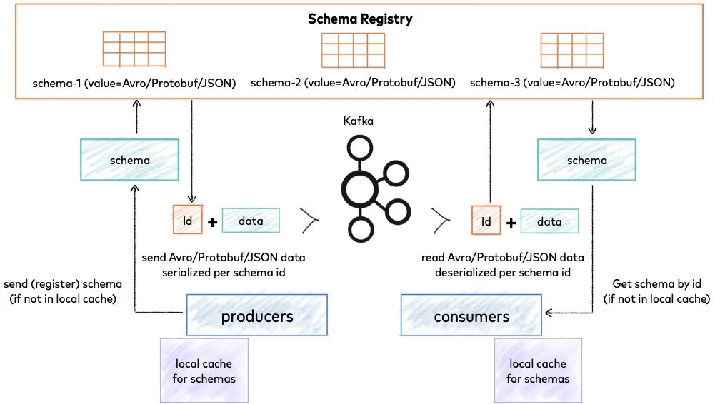 每个topic都有schema,且随着topic中数据结构的变化,schema会产生多个版本,每个版本的schema具有全局唯一id。一条完整的消息就由schema id和data两部分构成,在消费端读取消息时可以根据id找回schema,进而解析消息。