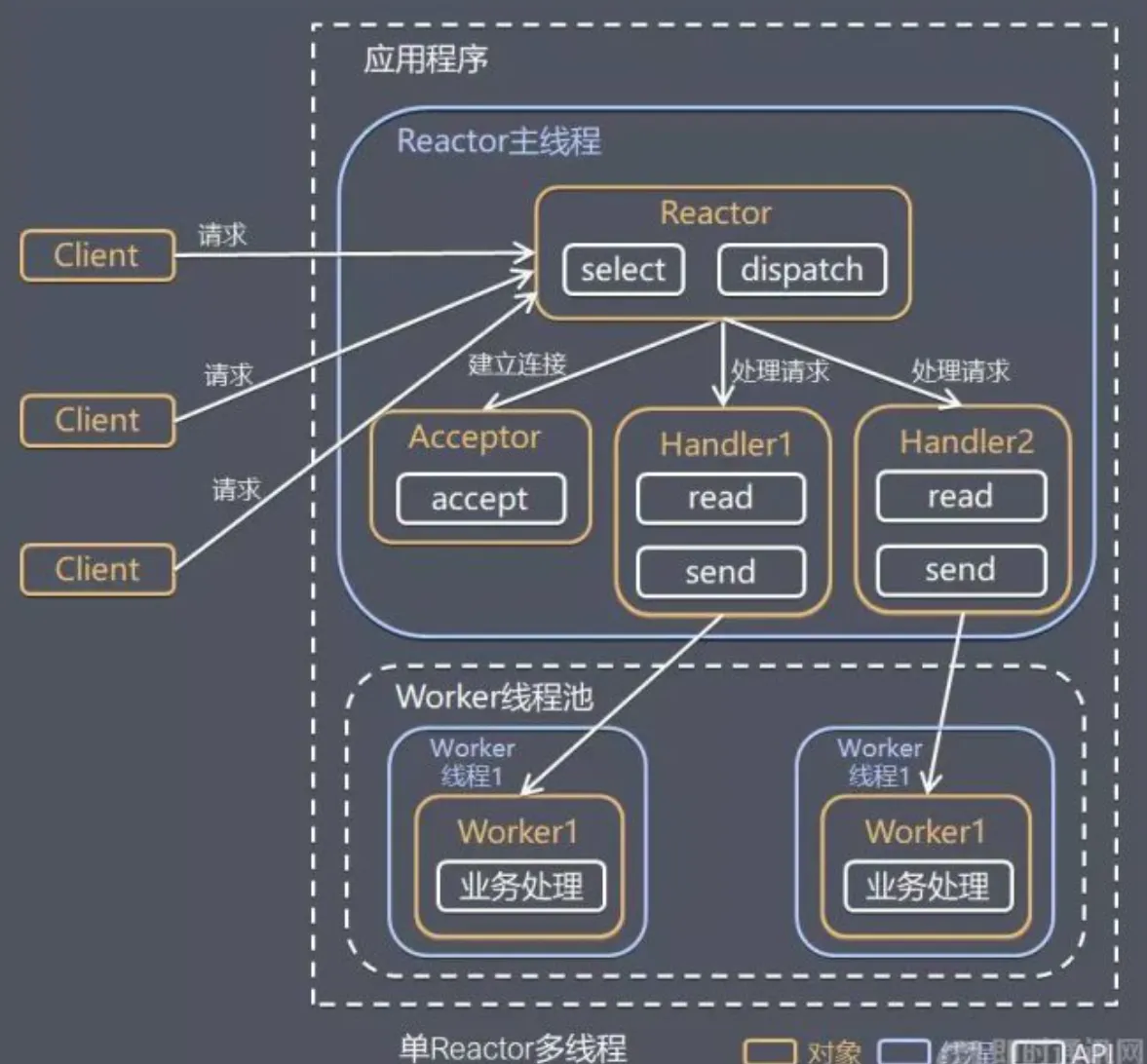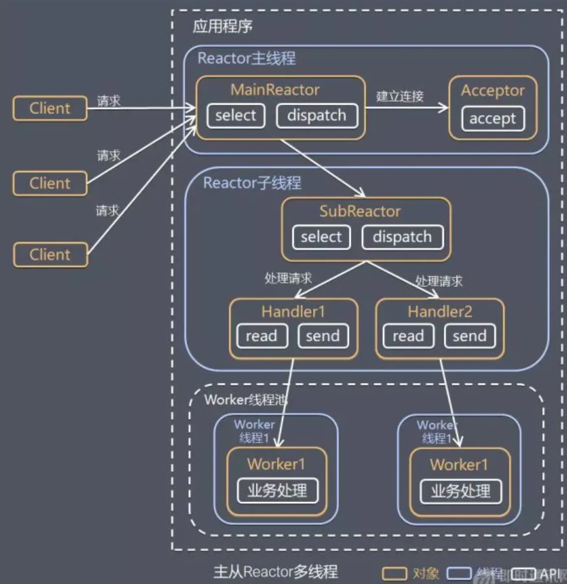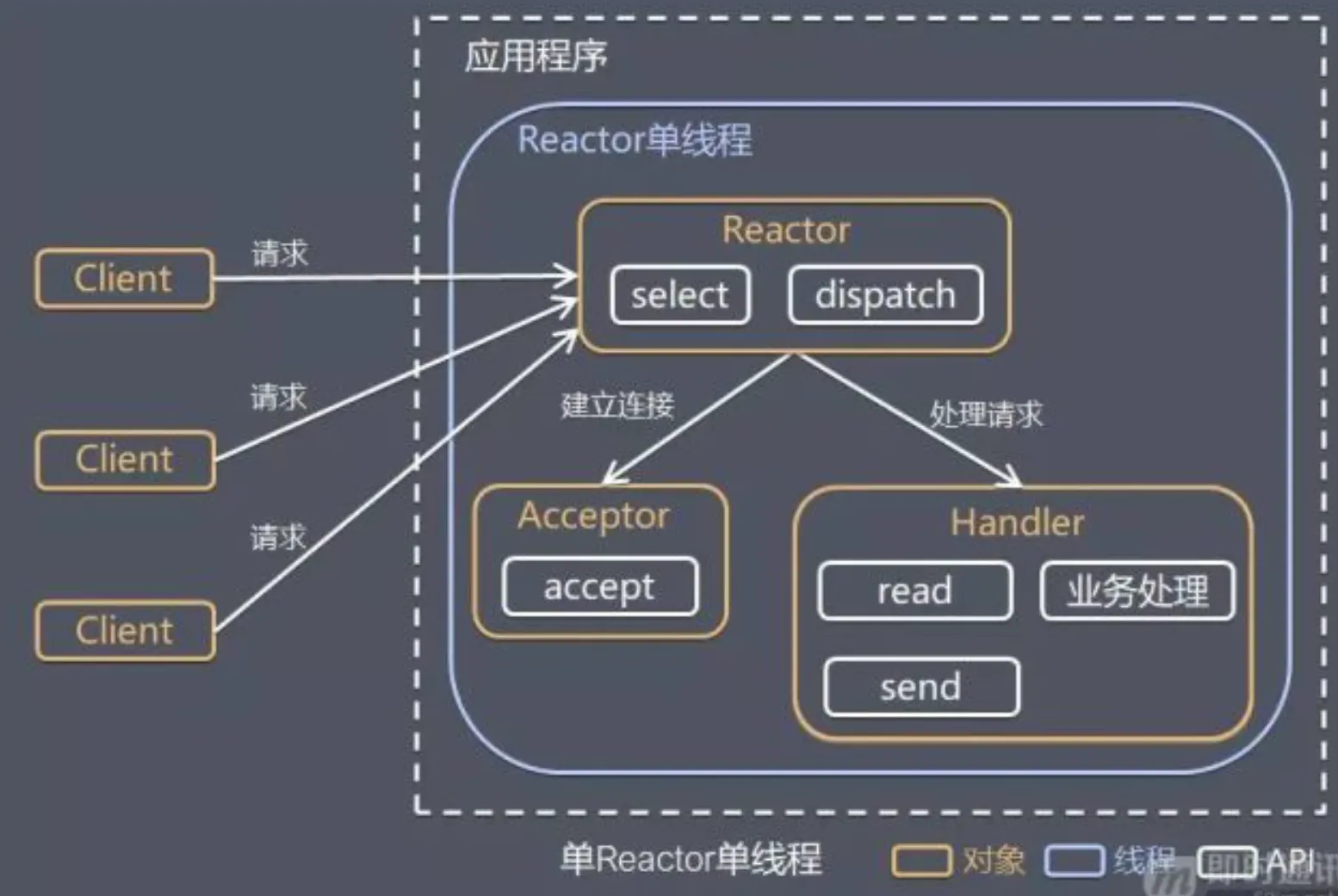 Reactor:负责监听和分配事件,将I/O事件分派给对应的Handler。新的事件包含连接建立就绪、读就绪、写就绪等。