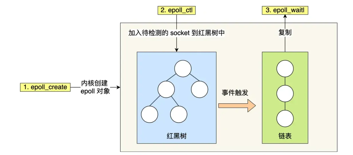 - 通过 **epoll_ctl **将待检测的socket,加入到红黑树中,并注册一个事件回调函数,当有事件到来的之后,会调用这个回调函数,进而通知到 epoll 对象。