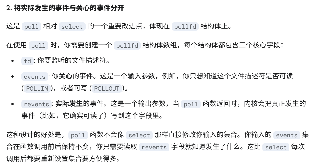 - poll 底层采用的是链表,没有连接数的限制,将实际发生的事件与关心的事件分开,但是呢没有解决遍历的问题,处理好数据后重置fd对应的revent即可