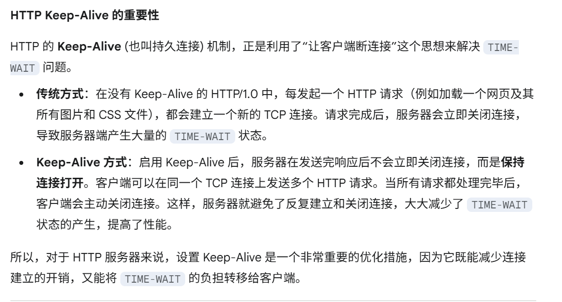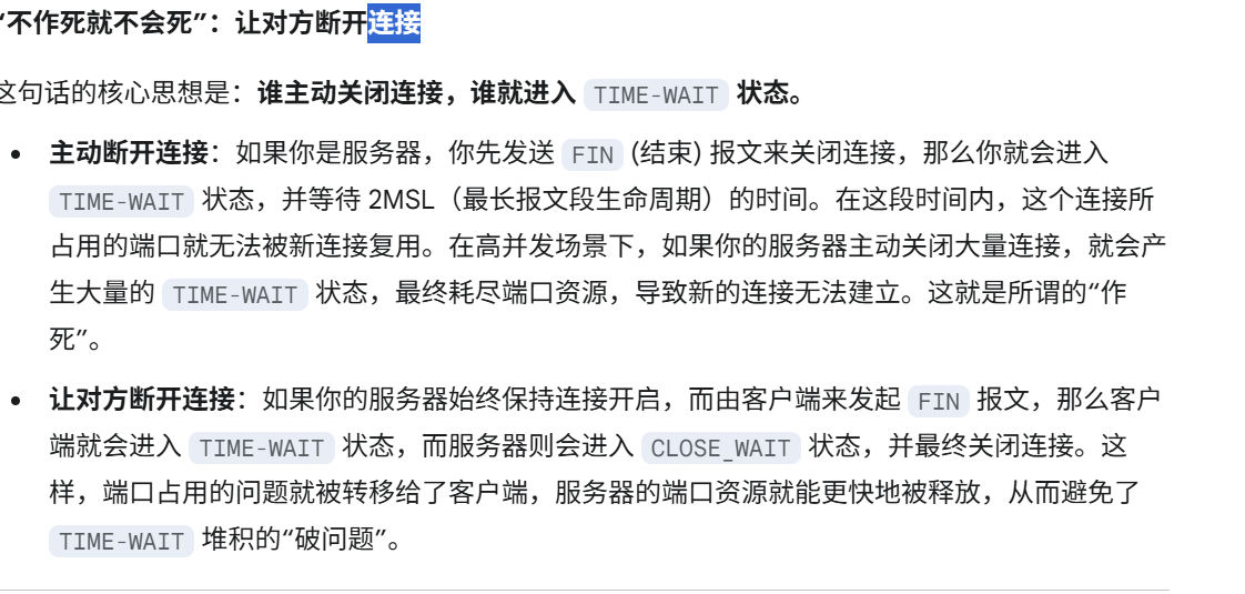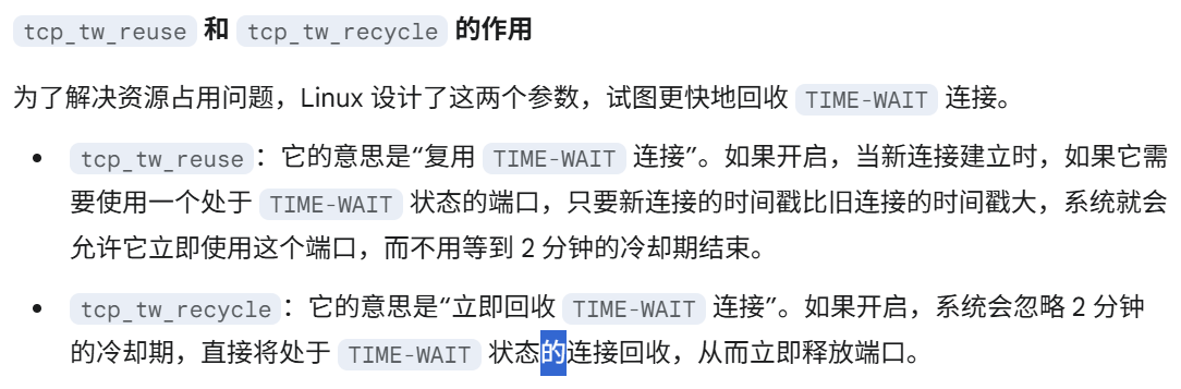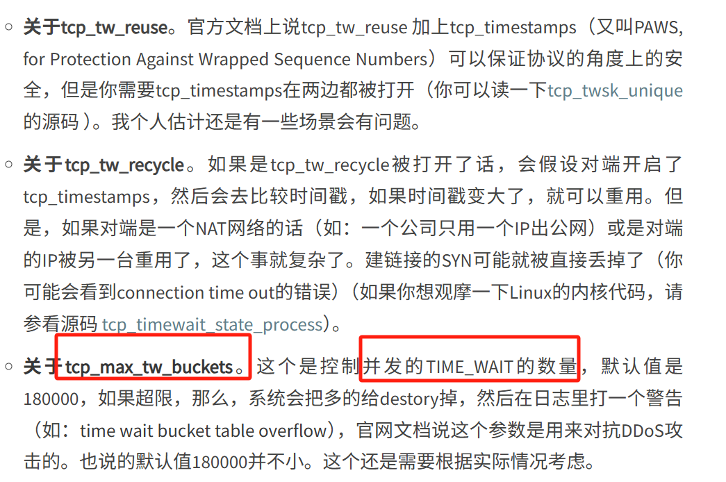 - 关于TIME_WAIT数量太多。这在主要体现在有大量短连接请求下(比如http1/2)。timewait太多是会占据掉大部分资源的。但你去网上搜相关教程,太多都会去教你去调两参数 tcp_tw_reuse,tcp_tw_recycle。这两个参数默认都是关闭的,两个参数涉及到的机制都比较激进。