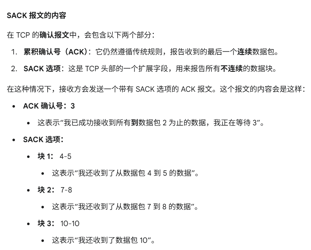 - 接收端会发送一个 ACK 报文,其确认号为 3。这表明它成功收到了序号 1 和 2 的数据,并期望收到序号为 3 的数据。