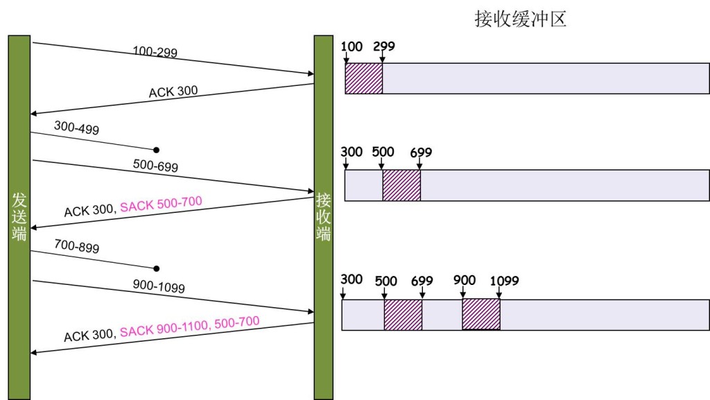 所以,发送方也不能完全依赖SACK,还是要依赖ACK,并维护Time-Out,如果后续的ACK没有增长,那么还是要把SACK的东西重传,另外,接收端这边永远不能把SACK的包标记为Ack。