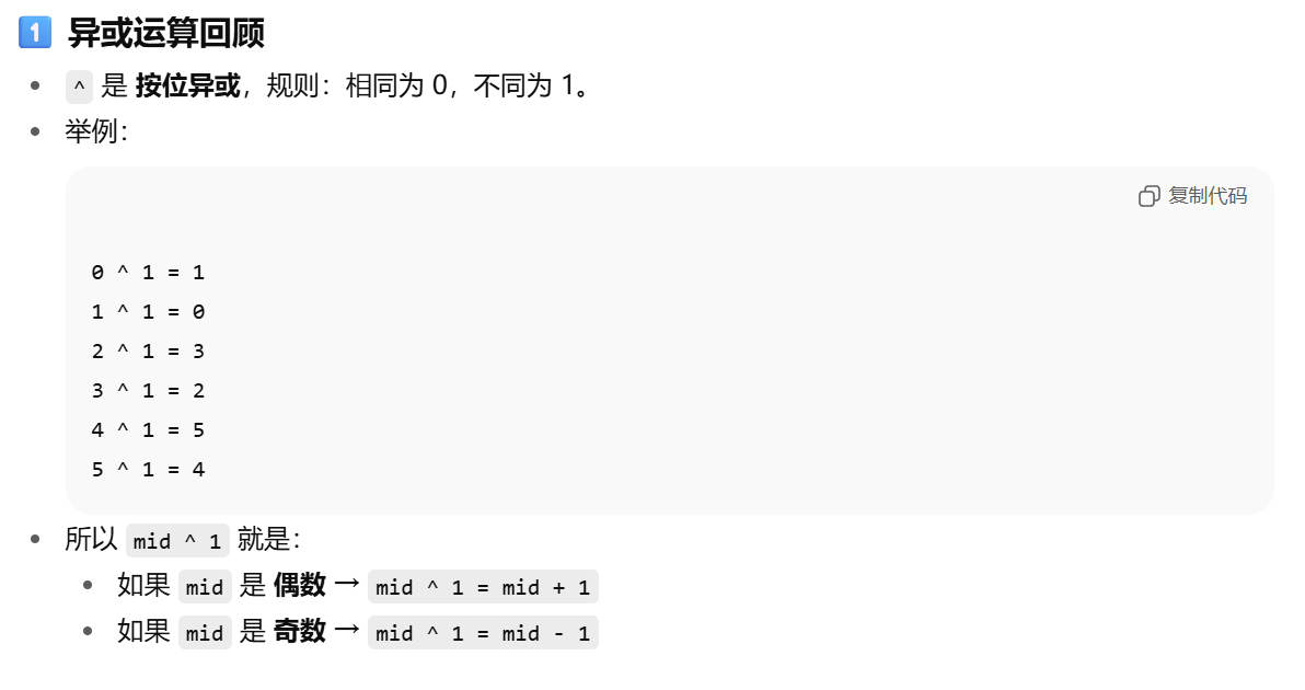 变种:字节后端,变成有序数组,需要O(logN)复杂度。 思路:二分查找,如果nums[mid]出现了两次,则左边或右边肯定有一边剩余了奇数个数字,朝奇数个的方向走。