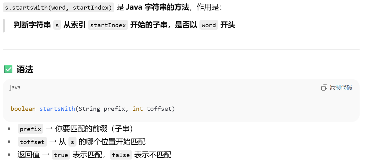 - boolean startWith(String s,int t) 判断父字符串从startIndex开始的子串是否以word开头