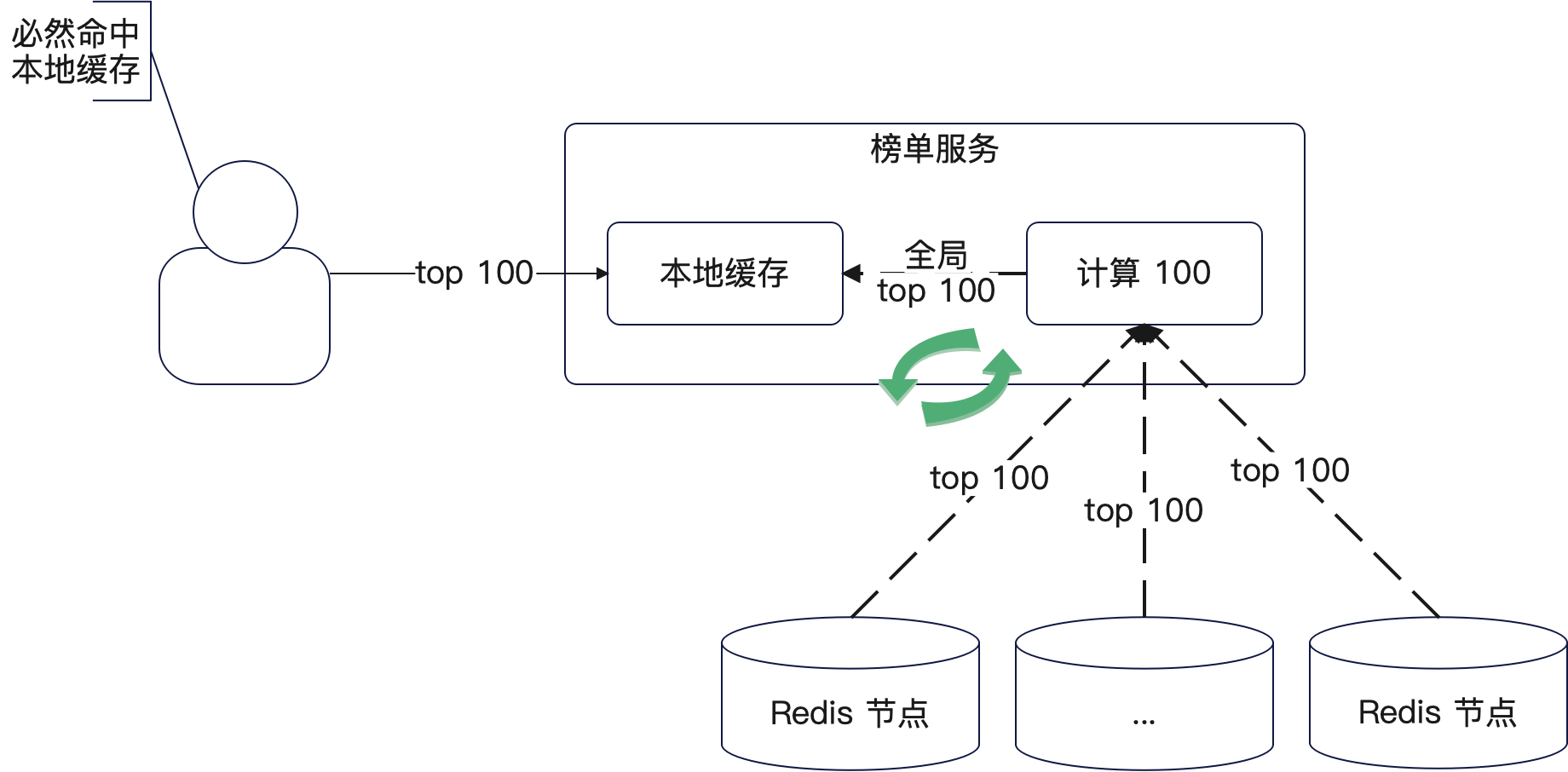 - 定时任务会把这 top100 的数据同步到各个节点的本地缓存中