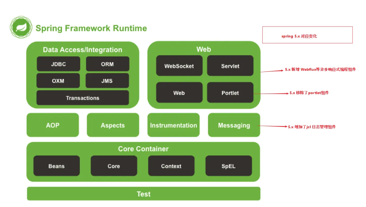 spring4.x的组件图,5.x的变化在图中标注出来了
