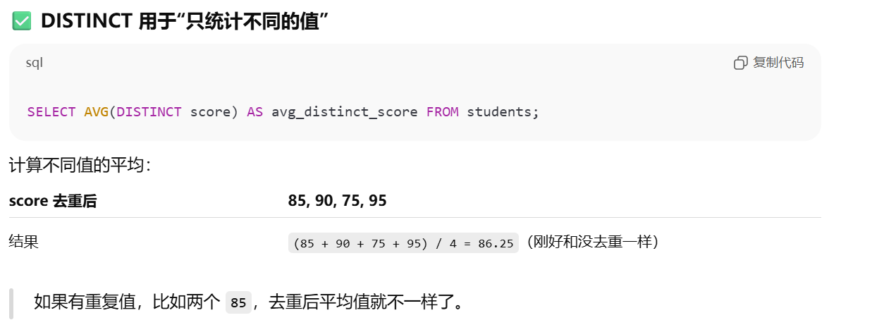 计算平均值(忽略 NULL) | SELECT AVG(score) FROM students; |